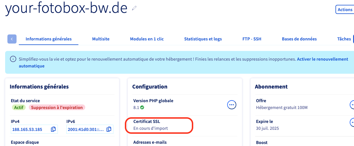 Je viens comme tous les 2,5 mois de tenter de renouveler mon certificat ssl et maintenant j’ai depuis 15h dans l’interface certificat ssl en cours d’import et pas de mouvement. Je ne peux ni vérifier l’état d’avancement ni supprimer pour réessayer.