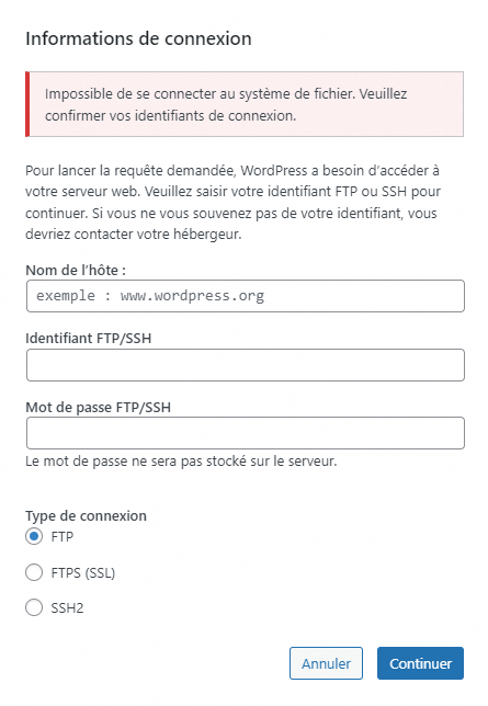 Premier problème, dès que je veux faire quelque chose comme installer une extension on me demande de me connecter en ftp. Donc je suis aller regarder comment faire et chercher les informations, mais je n'ai pas réussi à établir la connexion. J'ai pris les informations que OVH nous donne dans hébergement - FTP SSH mais wordpress me dit ça : "Le couple identifiant/mot de passe est incorrect" même en ayant modifié le mdp.