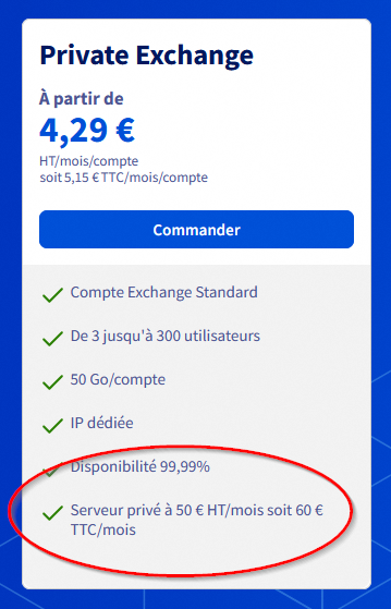 Bonjour, je paye actuellement un hosted-exchange 5,99€ HT / mois pour un seul compte (=1 seule boite) or je constate que les offres ont évolué sans que l'on me propose une migration gratuite vers les nouvelles offres qui sont moins chères y compris l'offre la plus chère (private Exchange à 4,29€ht / mois) !!!