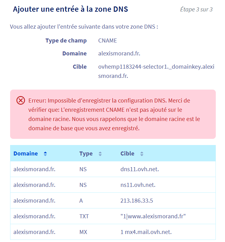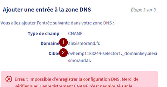 En (1) c'est "ovhemp1183244-selector1._domainkey.alexismorand.fr." que vous devez mettre