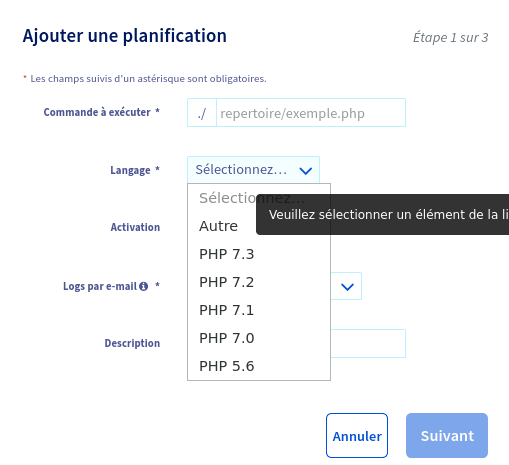 Je souhaiterais lancer une tâche exécutable avec php 7.4 mais ce n'est pas proposé dans les propositions de langage. J'ai essayé avec PHP 7.3 et forcément ça ne fonctionne pas ; idem avec "Autres". Que puis-je faire ?