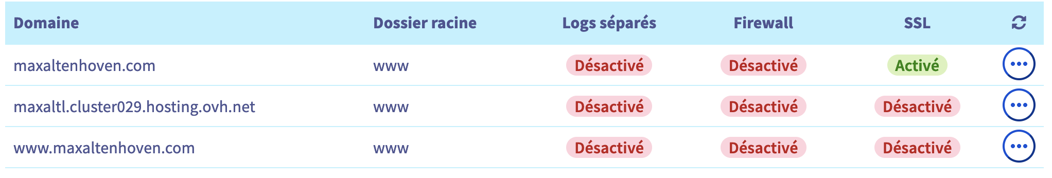 Je n'ai juste pas régénérer le certificat d'hébergement OVH (je ne trouve pas comment faire et je ne veux pas cliquer n'importe où) et je n'arrive pas à supprimer la ligne "www.maxaltenhoven.com" dans la section "Multisite" car quand je clique sur modifier ça ne me propose pas l'option supprimer.