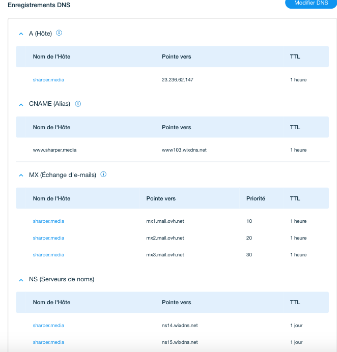 - Mes serveurs DNS sont donc ceux de Wix : ns15.wixdns.net & ns14.wixdns.net