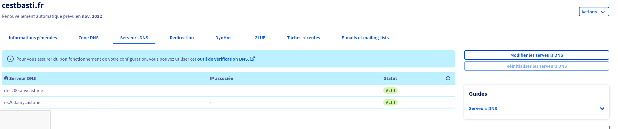 Est ce normal que mes serveurs DNS ne soient pas associés à une adresse IP ? Le cas échéant laquelle dois je utiliser ?