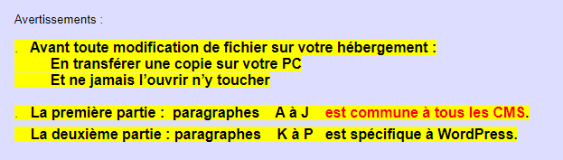 J'ai bien compris que votre site n'était pas réalisé avec WordPress, mais les les paragraphes : A à J restent valables pour tous les sites :