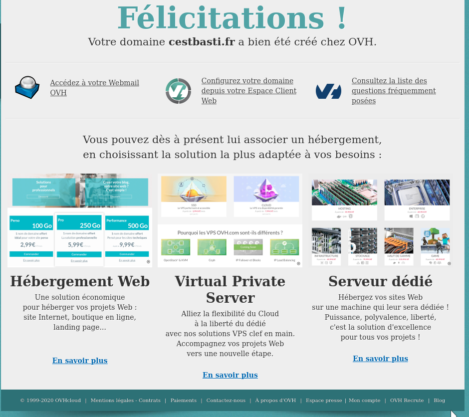 Si vous avez ce message de **"Félicitations votre domaine xxx a bien été créé chez OVH"**, veuillez tout d'abord corriger DNS et adresse IP suivant cette DOC :