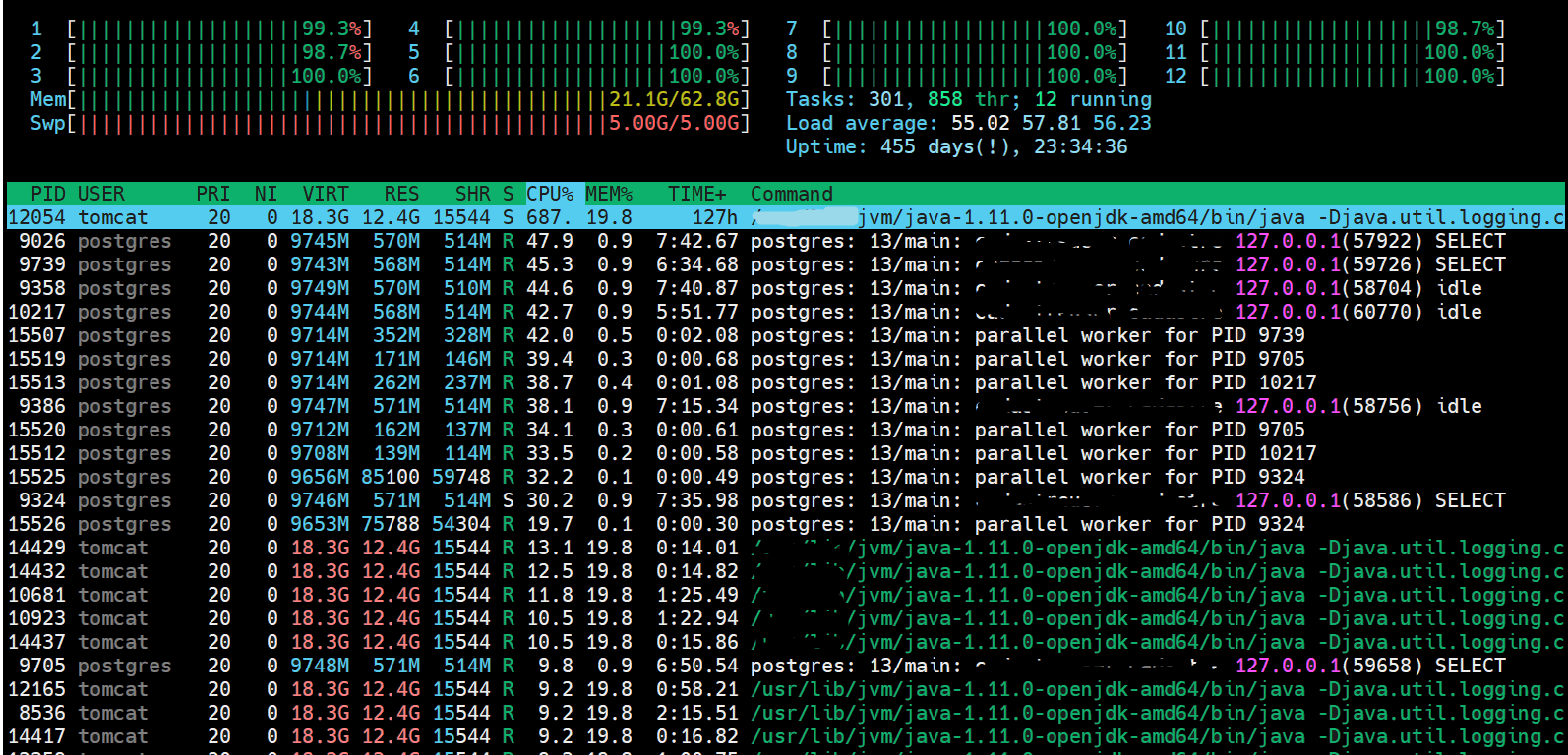A vue de nez c'est votre postgres qui fait 1200% de CPU, il ne vous manque pas des index dans votre base de données ?