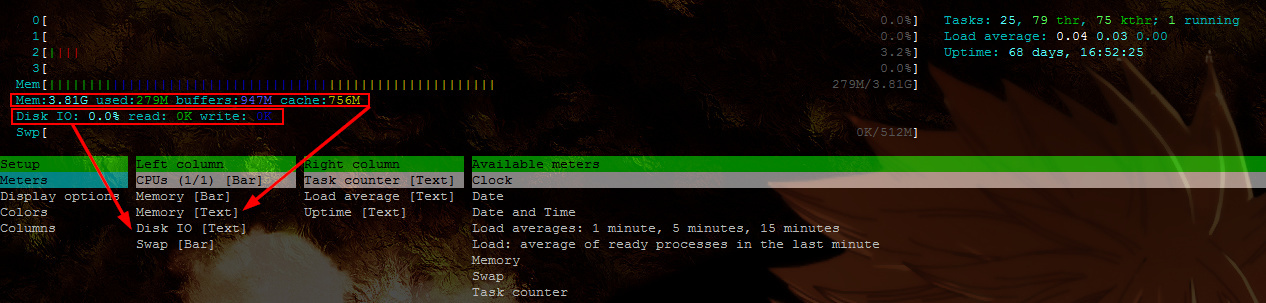Par contre vous devriez modifier les "Meters" de HTOP pour avoir plus d'informations (genre le détail pour la RAM et l'état de l'utilisation des disques) exemple :