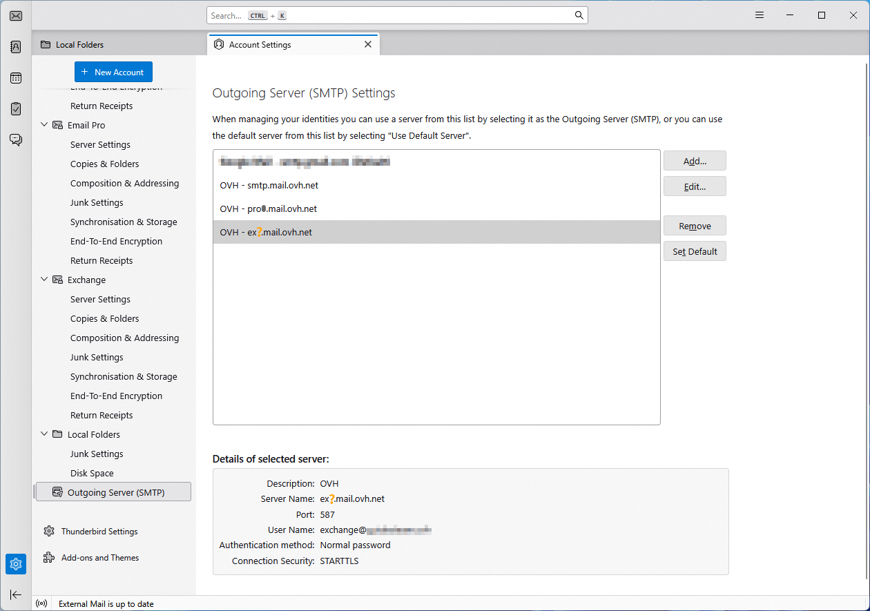 D'après la doc, Exchange (Hosted ou Private) possède un accès DMTP/STARTTLS: https://help.ovhcloud.com/csm/fr-exchange-thunderbird-windows-configuration?id=kb_article_view&sysparm_article=KB0053411