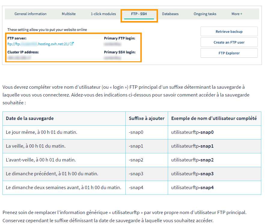 Voir : https://docs.ovh.com/fr/hosting/restauration-ftp-filezilla-espace-client/