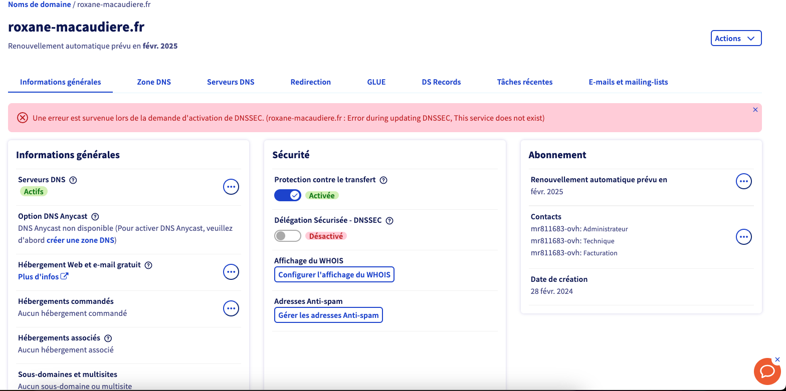 Je n'ai jamais basculé sur d'autres serveurs DNS que ceux d'OVH. Que je tente de réinitialiser les serveurs, d'activer DNSSEC ou autre j'ai toujours un message d'erreur à moment donné...