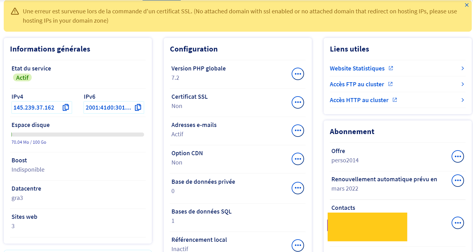 **Manager OVH > Web Cloud > Hébergement > VotreDomaine > Informations générales**