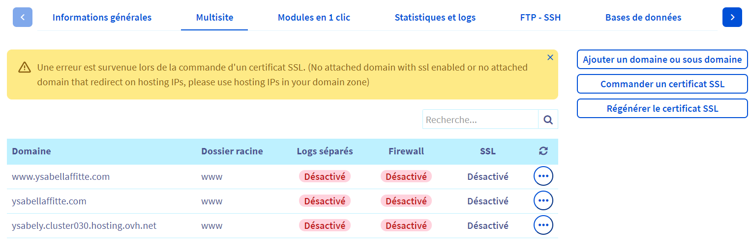 Une erreur est survenue lors de la modification du ou des domaines de votre hébergement mutualisé.