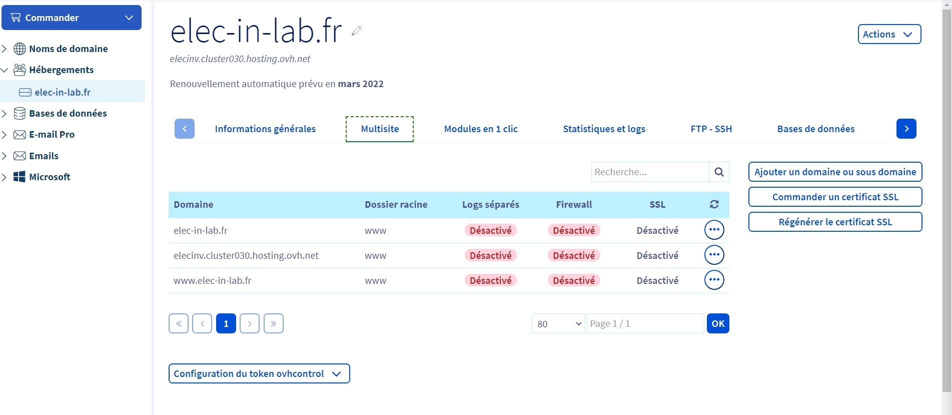 **Manager OVH > Web Cloud > Hébergement > VotreDomaine > Multisite**