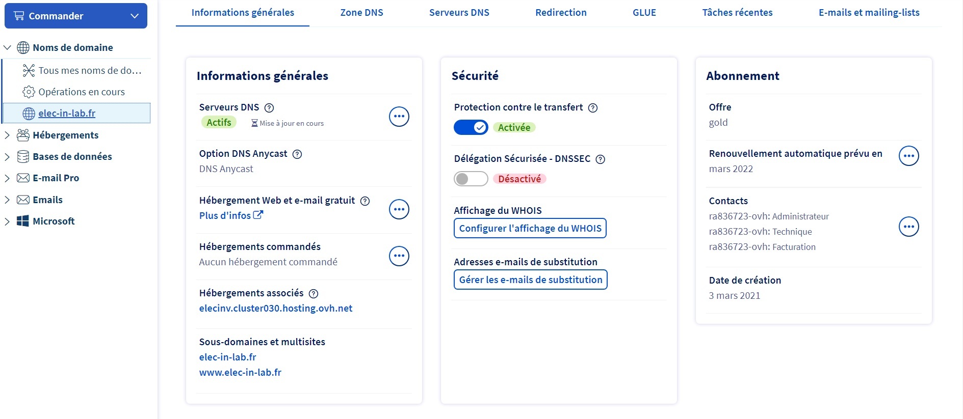 **Manager OVH > Web Cloud > Domaine > VotreDomaine > Informations générales**