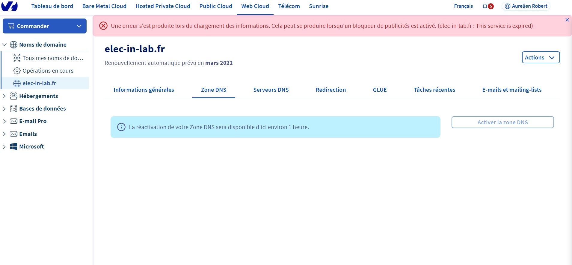 Aujourd'hui quand je vais dans zone dns j'ai un message d'erreur :