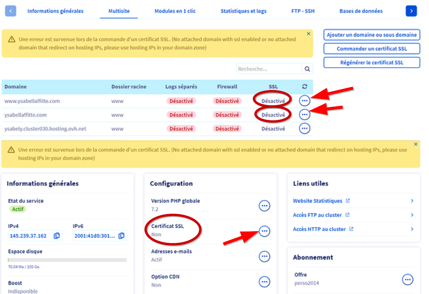 C'est normal que vous ne puissiez pas l'activer, votre domaine pointe vers 213.186.33.5 qui n'est pas votre hébergement.