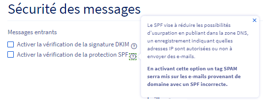 Les options "Activer la vérification de la signature DKIM et SPF", si je les coche, 50% des emails légitimes reçus sont tagués [SPAM], on a testé ça une journée ça a été une catastrophe, donc on ne le coche plus.
