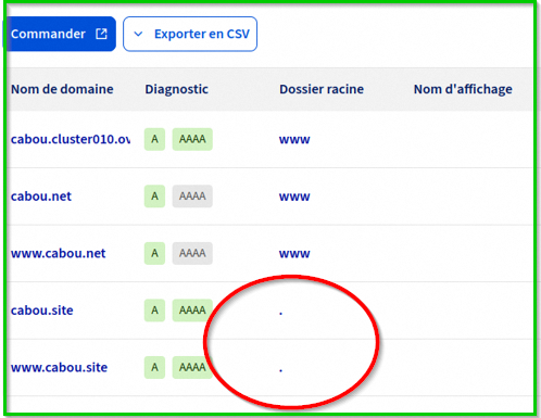 J'ai bien ajouté cabou.site dans le multisite à partir de cabou.net mais je ne sais pas comment faire pour qu'il soit dans le même dossier racine, par ailleurs, je ne sais pas si les bandeaux gris "AAAA" posent problème.