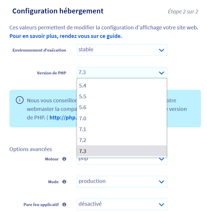 Malheureusement, OVH ne propose rien au dessus de PHP 7.3...
