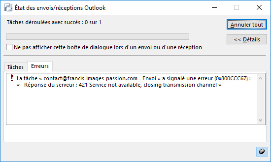 La tache "contact@francis-images-passion.com - Envoi " A signalé une erreur (0x800CCC67): "Réponse serveur : 421 Service not available, closing transmision channel"