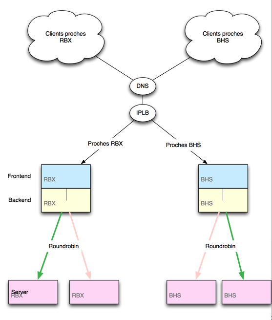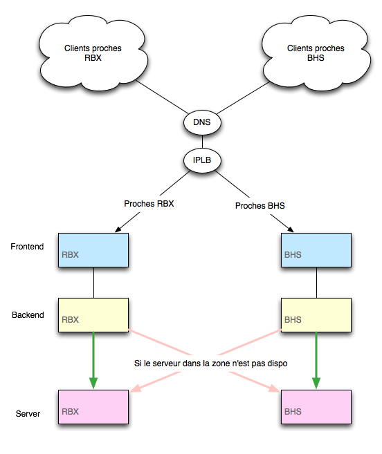 Une fois cette configuration déployée, les clients les plus proches de BHS seront pris en charge par la zone BHS de ton IPLB, qui contient la configuration pour ton serveur de BHS, et de la même manière pour les clients plus proche de RBX.