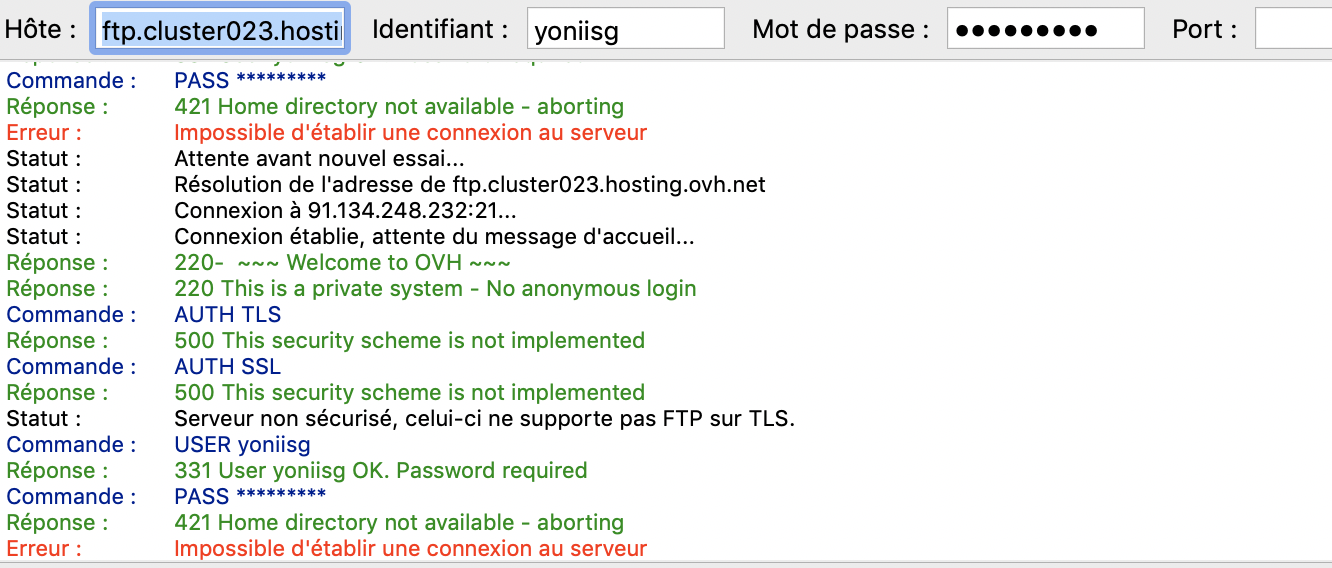 manager Ovh/hébergement/ftp-ssh: change le et attends 15 à 20mn qu'il soit effectif