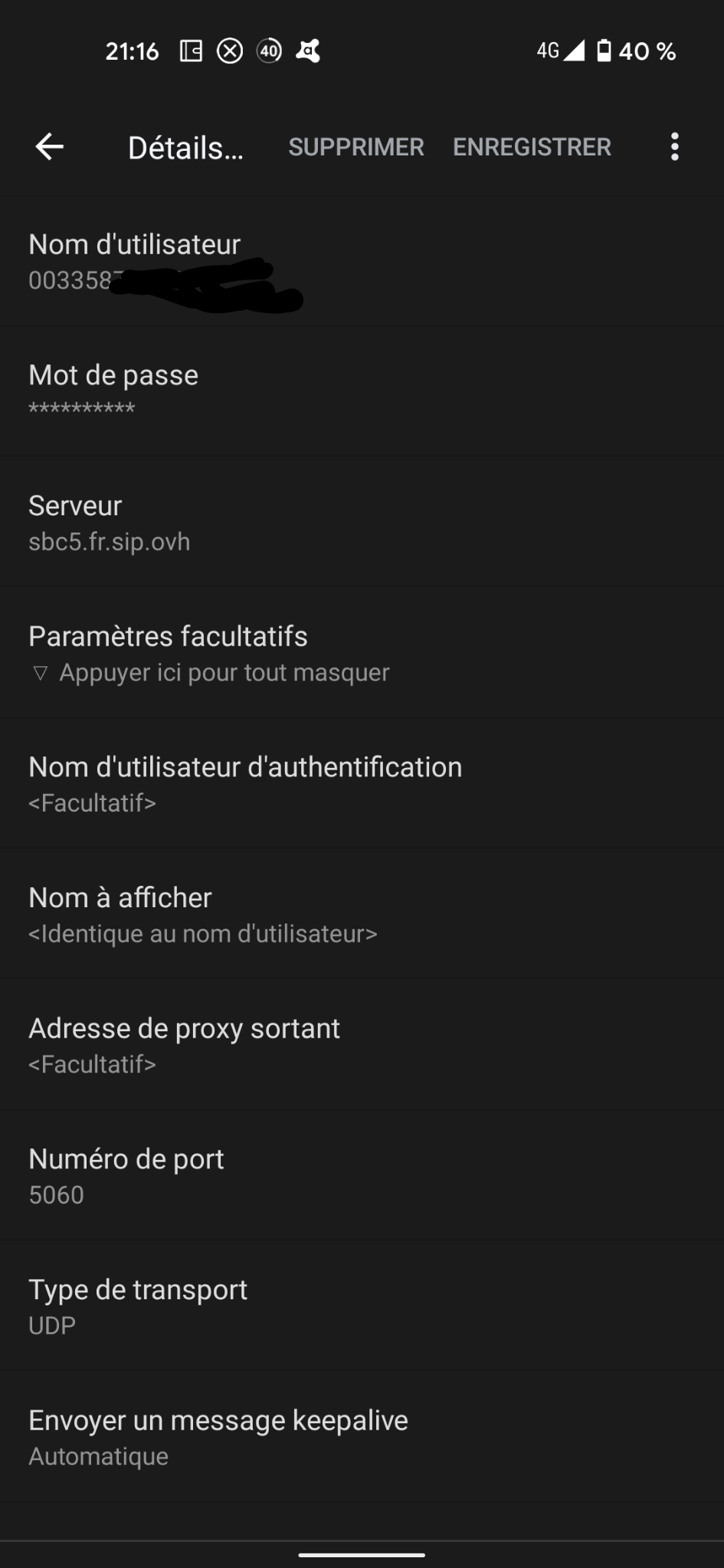 - Configuration SIP VOH avec une application SIP sur android