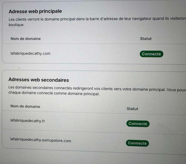 J'ai bien réussi à relier les deux noms de domaine en direction du site SumUp avec comme adresse principal : "lafabriquedecathy.com"