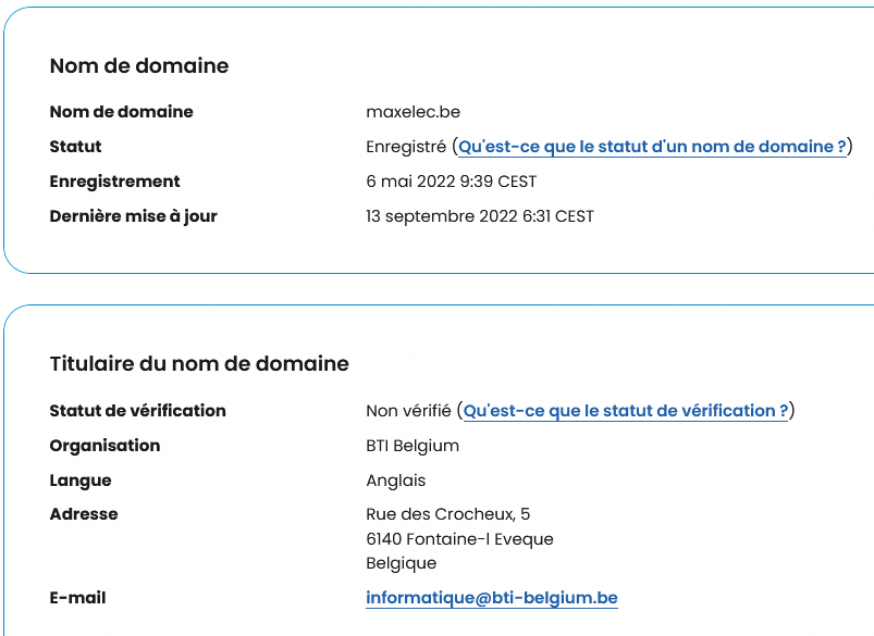 Je ne comprends pas que ce nom de domaine en date du 06/05/2022 appartient à la societé BTI Belgium .