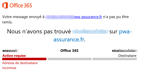 Il est arrivé à 3-4 reprises que lorsque j'envoie depuis mon mail à moi un message à une destinataire O365, Office me renvoie un message d'erreur en me disant que le destinataire n'existe pas. Si je retente l'envoi avec exactement le même dest, le mail passe... Problème de mise en cache du client de messagerie peut-être ?