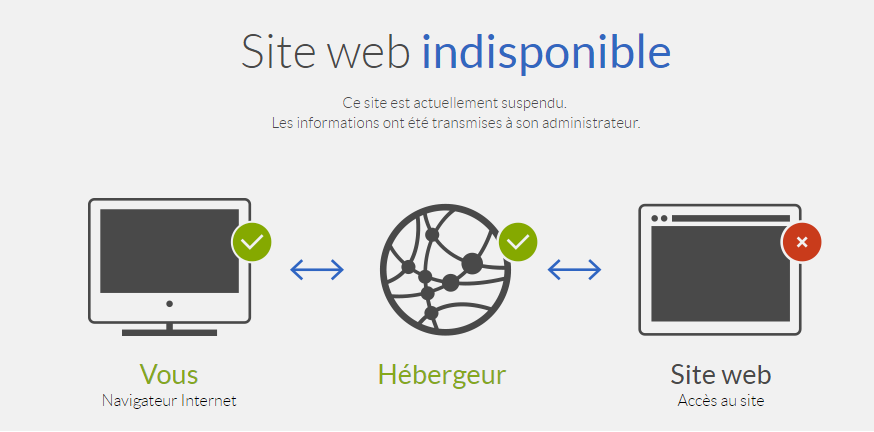 bah oui puisque le message indique que votre site est **SUSPENDU** donc il est **pas** planté, il a été **volontairement coupé** pour une raison (indiqué par mail normalement, avec une copie dans le manager) qui est contraire aux CGU/CGV et/ou la loi et/ou sur un abuse et/ou une détection de faille/virus/phishing