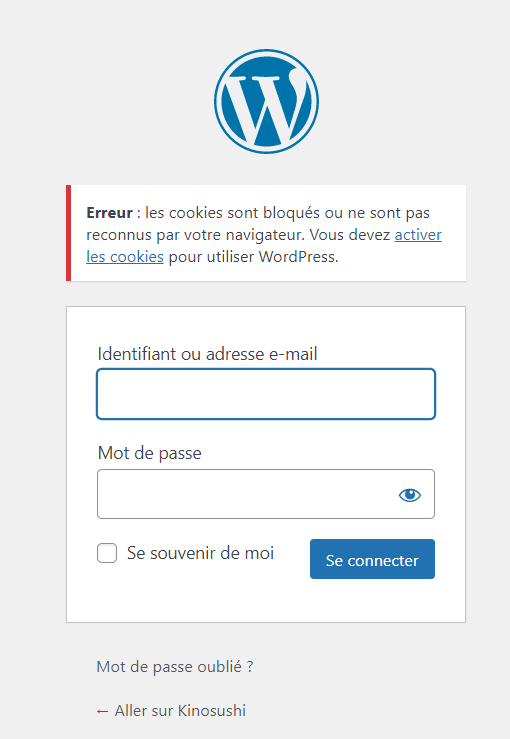 Et quand je rentre mes identifiants, Wordpress me met un problème de cookies et ne se connecte pas:
