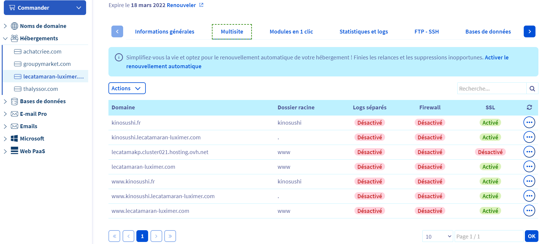 **Manager OVH > Web Cloud > Hébergement > VotreDomaine > Multisite**