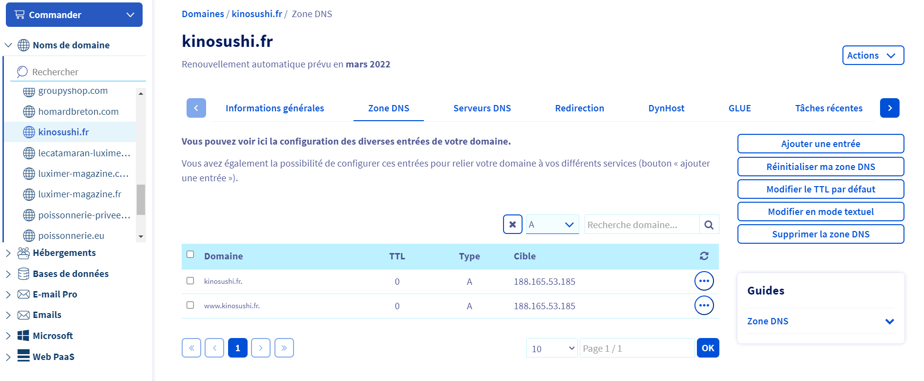 **Manager OVH > Web Cloud > Domaine > kinosusi.fr > Zone DNS**