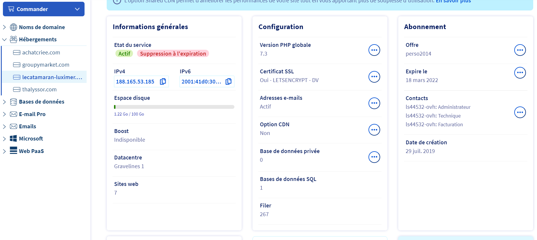 **Manager OVH > Web Cloud > Hébergement > VotreDomaine > Informations générales**