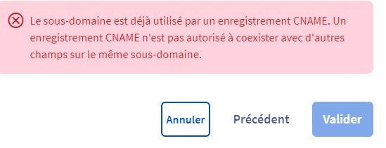 _"Le sous domaine est déjà utilisé par un enregistrement CNAME. Un enregistrement CNAME n'est pas autorisé à coexister avec d'autres champs sur le même sous-domaine."_