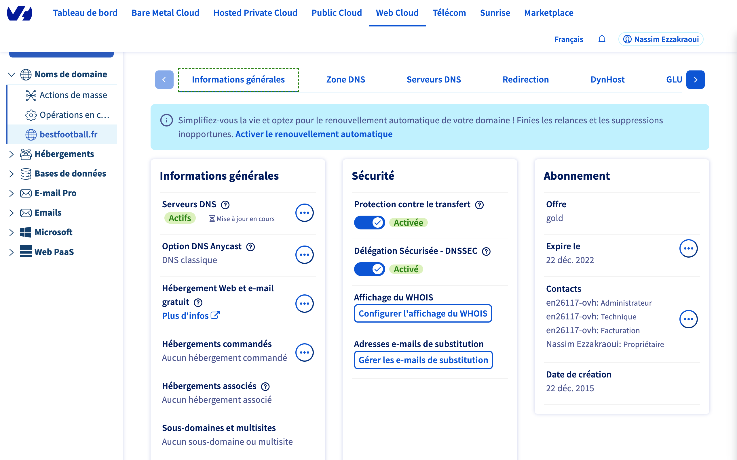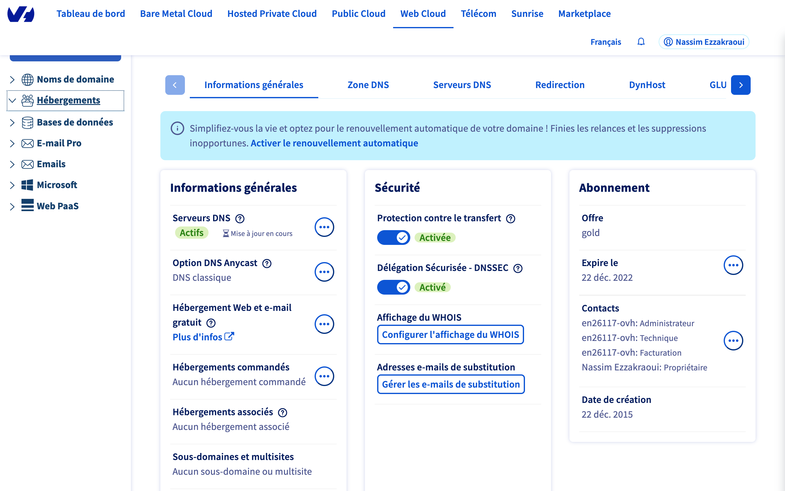 **Manager OVH > Web Cloud > Hébergement > VotreDomaine > Informations générales**