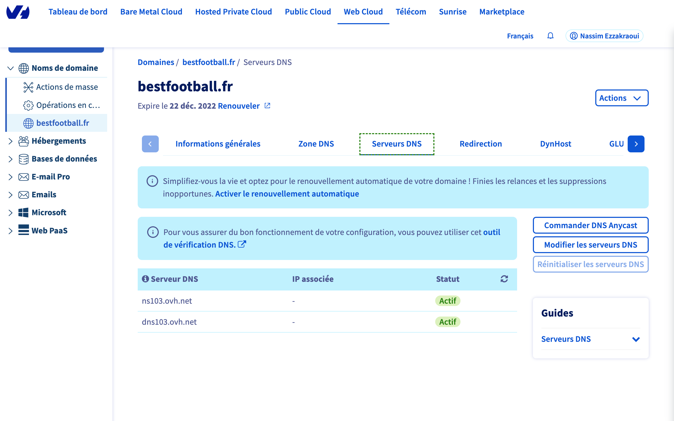**Manager OVH > Web Cloud > Domaine > VotreDomaine > Serveurs DNS**
