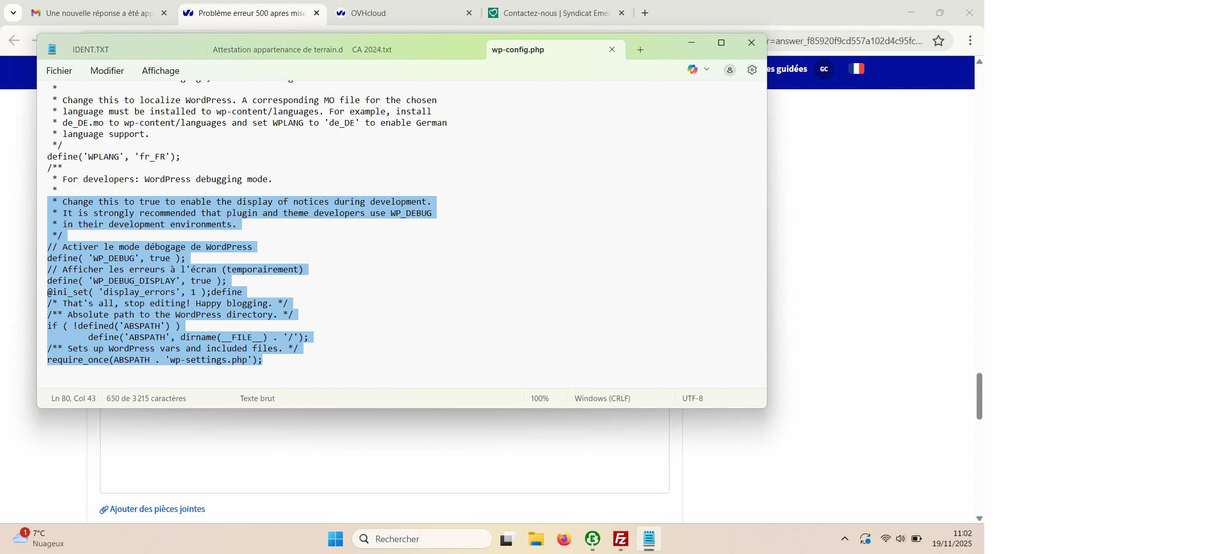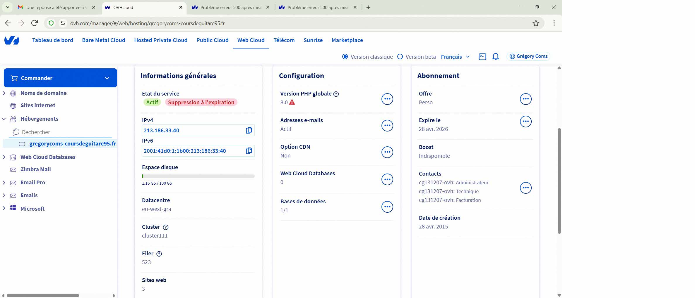 J'ai passé plusieurs heures avec une IA qui m'a donnée des actions à faire tel que désactiver le dossier plugin, le thème et autres. J'ai regardé les supports sur ovh mais je m'y perd complètement. J'ai contacté le service technique qui m'a informé qu'il n'y a pas de soucis à leur niveau.