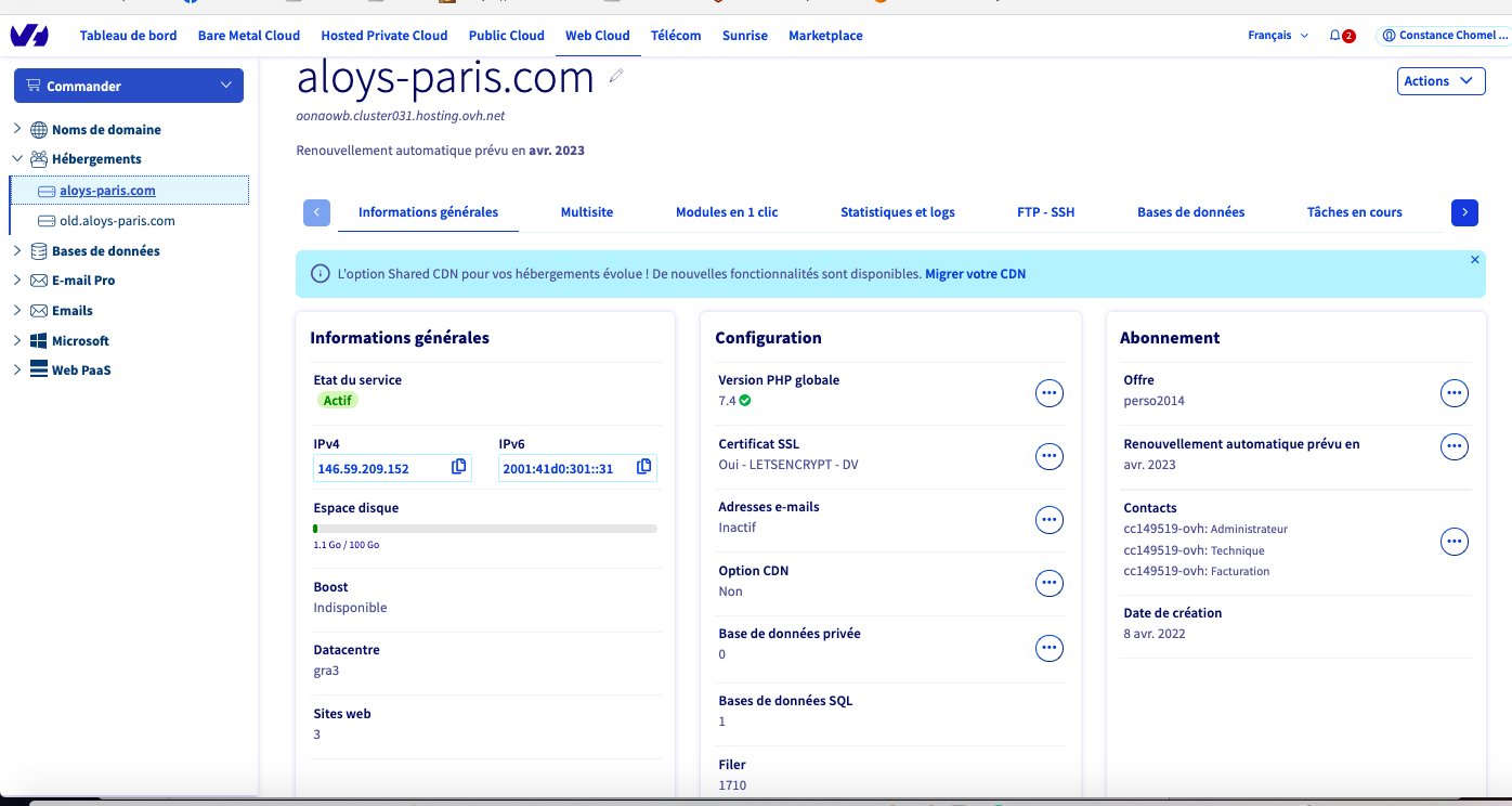 **Manager OVH > Web Cloud > Hébergement > VotreDomaine > Informations générales**
