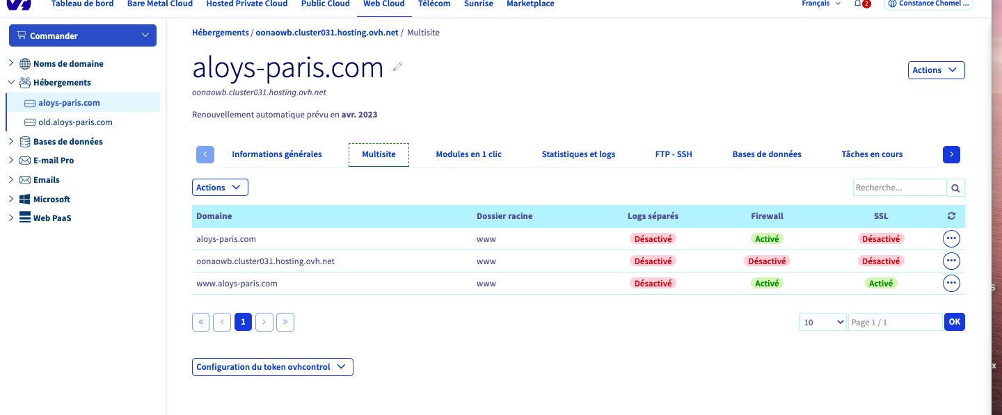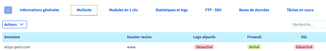 **Manager OVH > Web Cloud > Hébergement > VotreDomaine > Multisite**