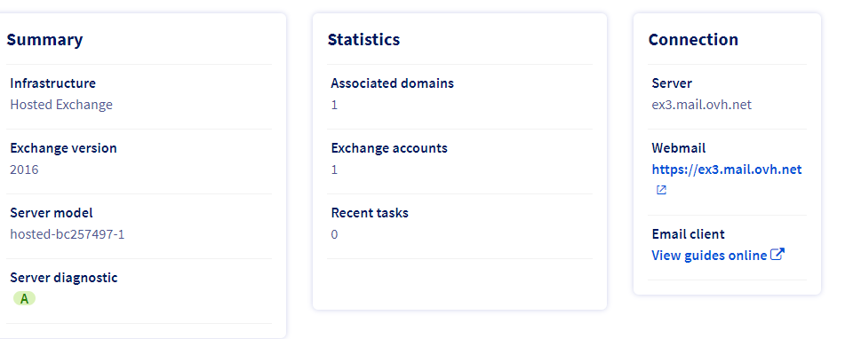 Voyez ces guides: https://help.ovhcloud.com/csm/en-ie-exchange-hosted-getting-started?id=kb_article_view&sysparm_article=KB0053269 (vous êtes sur le serveur ex3.mail.ovh.net d'après votre copie d'écran) et votre domaine est externe à OVH.