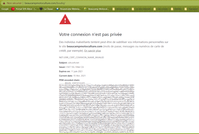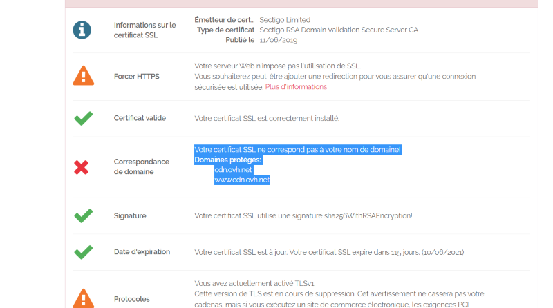 L'accès au site n'est pas sécurisé il faut forcer pour y accéder. et dans le test c'est dit que le certificat ssl ne correspond pas au nom de domaine.....