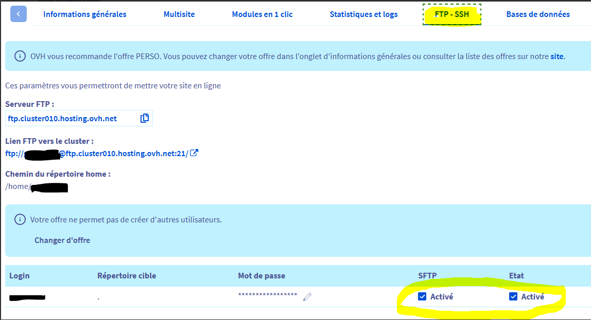 **Manager OVH > Web Cloud > Hébergement > FTP-SSH**