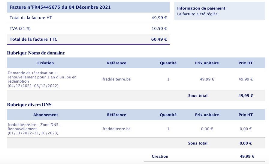 La facture suivante ne concerne donc que le nom de domaine et pas l'hébergement ?