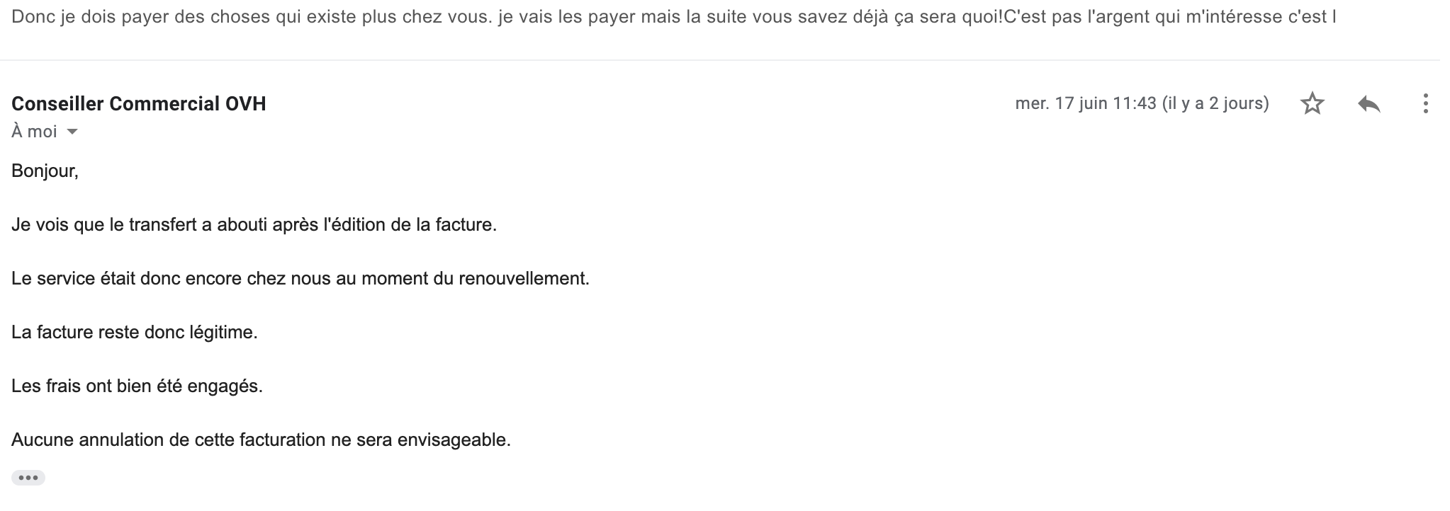 Comme dit par le service OVH si la facture a été émis avant transfert du service elle est légitiment dû.