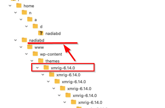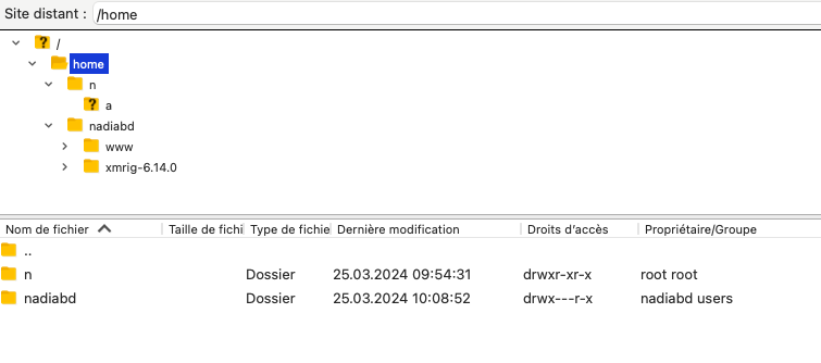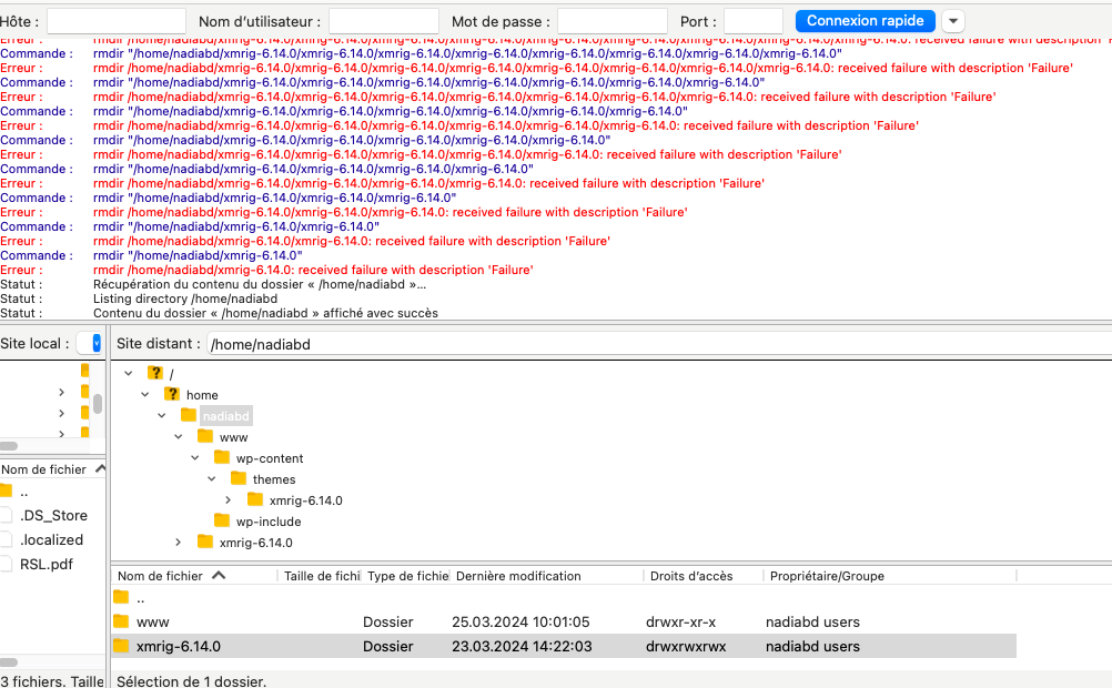 Lors du changement des droits, ça mouline longtemps entre les statuts « Récupération du contenu du dossier « /home/nadiabd/www/wp-content/themes/xmrig-6.14.0…(dossier ensuite répété un peu plus de 300 fois) » et en alternance « listing directory /home/…».