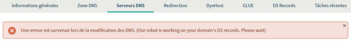 Une erreur est survenue lors de la modification des DNS. (Our robot is working on your domain's DS records. Please wait)