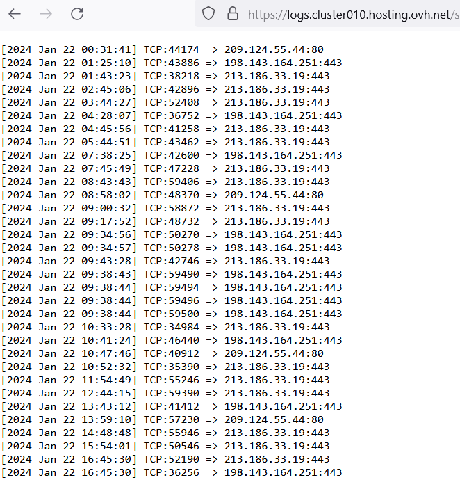 [2024 Jan 22 00:00:10] TCP:47098 => 46.105.57.169:443
